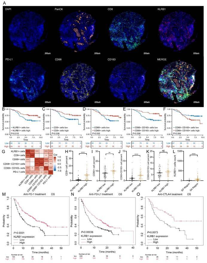 图 10A 呈现了高 KLRB1 表达组中 PanCK、CD8、KLRB1 等标志物的 mIHC 图像;通过该技术对蛋白表达的量化,得出图 10B-F 中 KLRB1 + 细胞、CD8+T 细胞等与患者预后的关联,以及图 10H-K 中不同 KLRB1 表达组的免疫细胞浸润差异;图 10L 基于该技术的空间分析,显示 KLRB1 在肿瘤基质区的高表达,进一步支持其在免疫调节中的作用