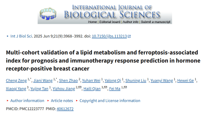 2025年3月,中国医学科学院北京协和医学院和复旦大学上海医学院团队联合在International Journal Of Biological Sciences上发表题为Multi-cohort validation of a lipid metabolism and ferroptosis-associated index for prognosis and immunotherapy response prediction in hormone receptor-positive breast cancer论文。