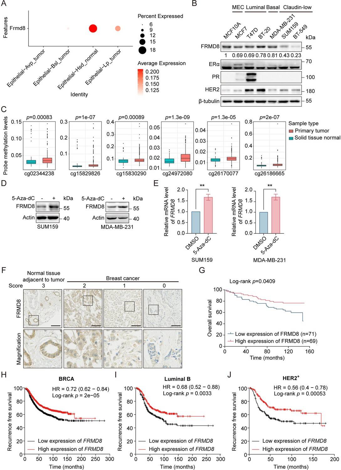 在临床相关性研究中(Figure 6),团队利用Tissue Gnostics的TissueFAXS系统对乳腺癌组织芯片(TMA)进行FRMD8免疫组化染色的定量分析。该系统能够对TMA中的数百个组织芯进行高通量扫描,并通过AI算法自动排除坏死区域和背景干扰,实现蛋白表达的精准量化。基于TCGA数据库分析和5-Aza-dC处理实验,证实FRMD8在乳腺癌中的低表达与启动子区高甲基化相关,而DNA甲基化抑制剂可显著恢复FRMD8表达。通过Tissue Gnostics的定量分析,将乳腺癌患者分为FRMD8高表达组和低表达组。 Kaplan-Meier生存分析显示,FRMD8低表达患者的无复发生存期(RFS)和总生存期(OS)均显著缩短(p=0.0409),提示FRMD8可作为乳腺癌预后的分子标志物。